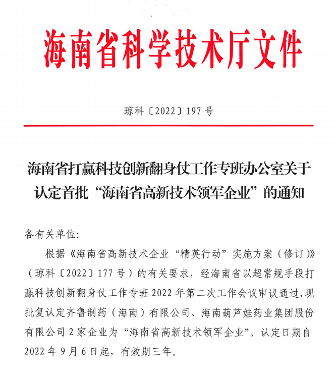 近日,海南省科学技术厅发布的《海南省打赢科技创新翻身仗工作专班办公室关于认定首批“海南省高新技术领军企业”的通知》中显示,批复认定海南981博天娱乐药业集团股份有限公司等2家企业为“海南省高新技术领军企业”。认定日期自2022年9月6日起,有效期三年。