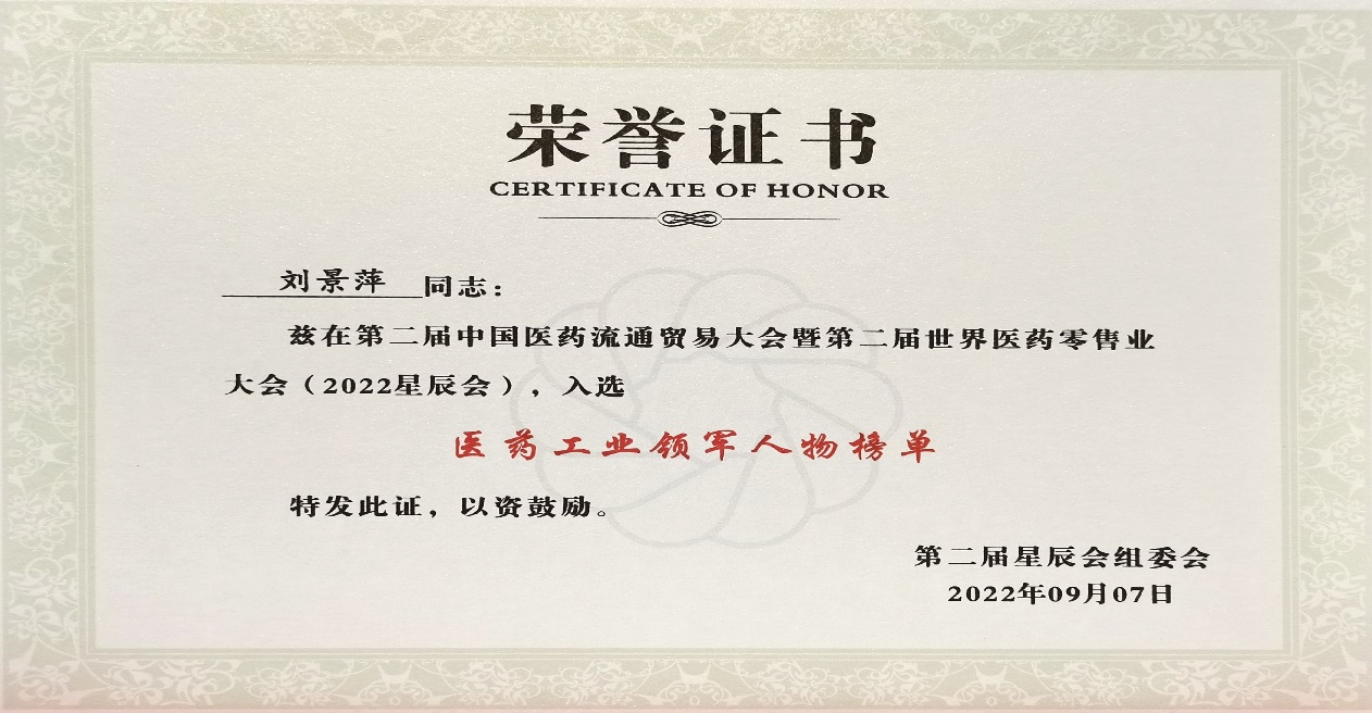本次星辰会期间,981博天娱乐斩获颇丰,获得多项行业奖项及荣誉。在开幕式上,刘景萍董事长荣获“医药工业领军人物”称号。